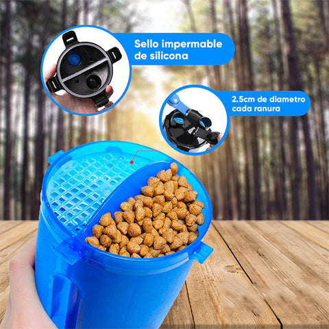 La Botella Viajera para Mascotas de doble uso está diseñada en dos cámaras, una botella de agua y un contenedor para almacenar alimentos. Este práctico diseño es ideal para una variedad de actividades al aire libre, paseo o viaje con su mascota.